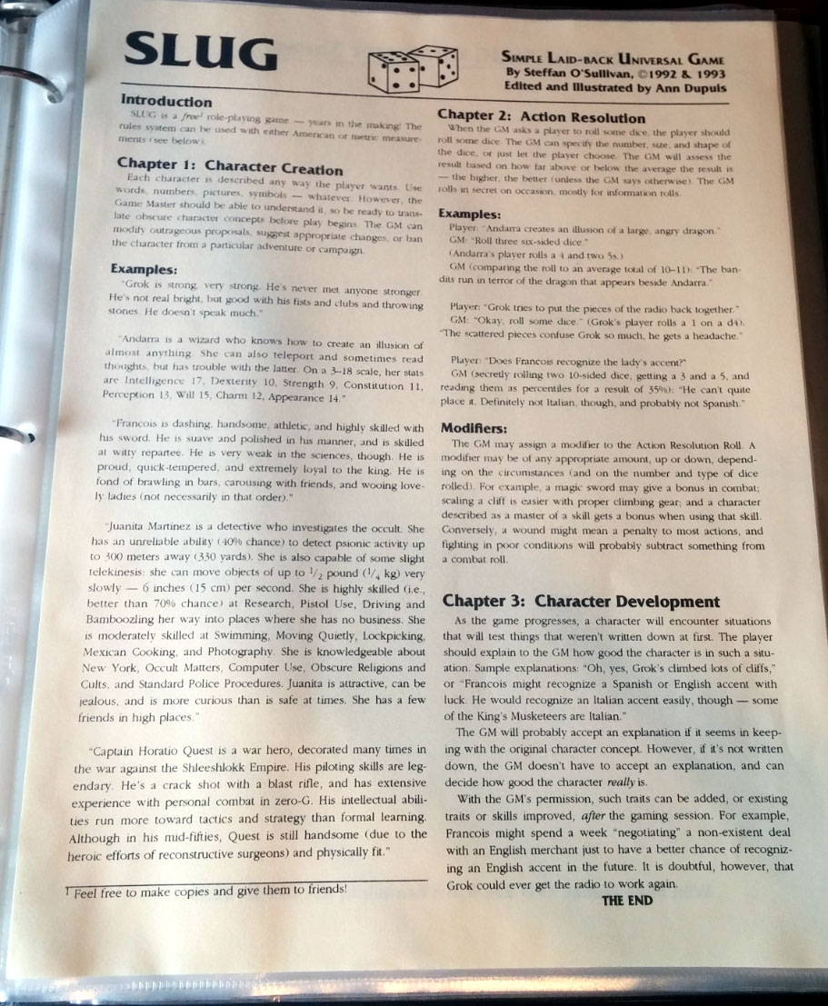 DeleteI had the privilege of playing a bit of SLUG and Fudge with Steffan O'Sullivan himself when he was attached to my college gaming club. It was pretty clear that SLUG was how he preferred to do roleplaying, and Fudge was kinda a tool built to appease players who wanted to show off action figure accessories. It was a very early and very fortunate lesson on focusing on fun-at-the-table rather than stats-in-the-book.